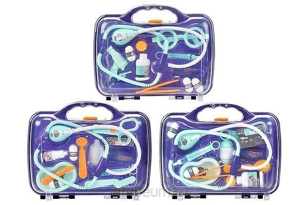 W zestawie: stetoskop, urządzenie do badania uszu, strzykawka, 3 narzędzia lekarskie, 2 tabletki, kartonik na leki, tacka, pojemnik na lek, funkcje: stetoskop - po naciśnięciu przycisku słychać dźwięk bicia serca, podświetla się dioda do rytmu, urządzenie do badania - po naciśnięciu przycisku włącza się światełko, wym. Opak. 28,5 x 23,5 x 7 cm, baterie 3 x ag13 (stetoskop), 3 x ag13 (urządzenie do badania) dołączone testowe, 3+