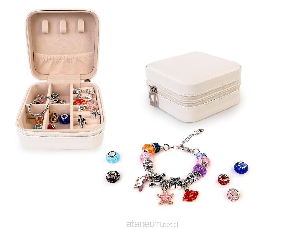 W zestawie: 6 koralików, 4 zawieszki, 3 medaliki, bransoletka o dł. 16 cm, kuferek ze skóry ekologicznej, zamykany na zamek, z przegródkami, haczykami oraz miejscem na zawieszki, wym. kuferka: 9,7 x 5 x 10 cm, 3+