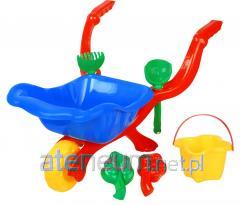 Taczka ogrodowa w kolorze zielonym wykonana jest z wysokiej jakości plastiku. Taczka posiada ruchome czarne koło, które pozwala jej na stabilną jazdę po różnych powierzchniach, dwie podpory umożliwiające jej postawienie na ziemi oraz dwa wygodne czerwone uchwyty. Podczas zabawy wyrwane chwasty można załadować na taczkę, a następnie przewieźć je w miejsce kompostowania. Niska waga taczki oraz jej rozmiar dostosowany do dziecięcych potrzeb pozwolą na wspaniałą zabawę w bezpiecznych warunkach. Pomaganie rodzicom w pracach ogrodniczych stanowi nie tylko świetną zabawę, lecz także wspiera rozwój umiejętności motorycznych i myślenia przestrzennego oraz zachęca dzieci do ruchu na świeżym powietrzu.