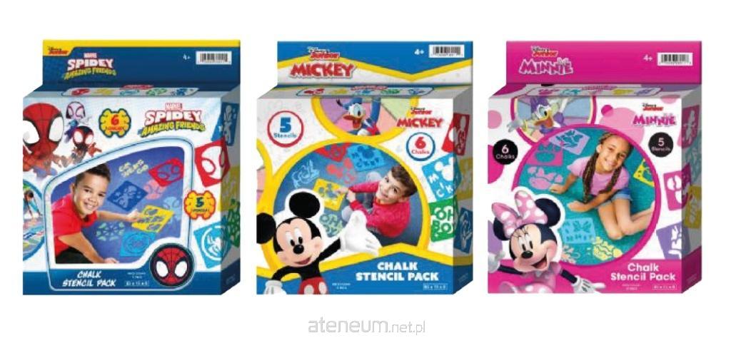 w zestawie 6 różnokolorowych kred i 5 szablonów, mix licencji Minnie, Spidey, Mickey, 12 sztuk w displayu, 4l+ cena za 1 szt, wysyłka losowo