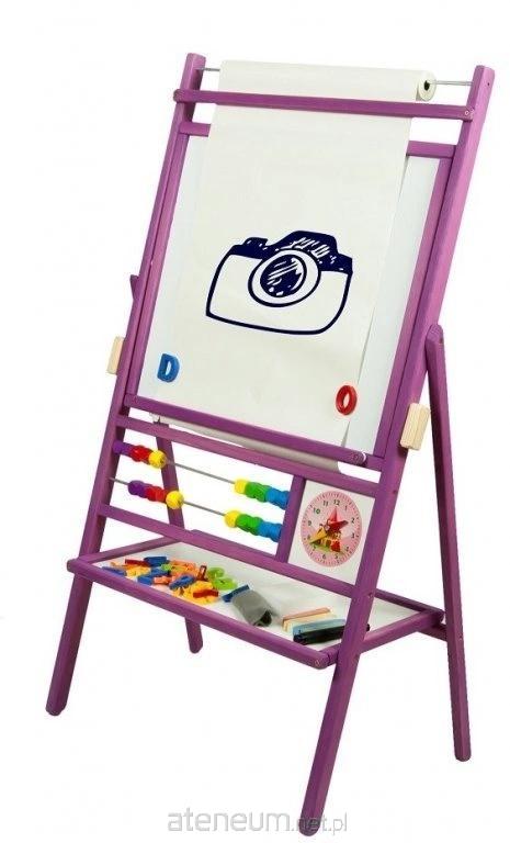Obrotowa, jasnofioletowa, suchościeralno-kredowo-magnetyczna tablica z 2-rzędowym liczydłem i rolką papieru do rysowania, 3 rodzaje zegara z ruchomymi wskazówkami. Wyposażona w gąbkę i kredę. Marker w zestawie.
