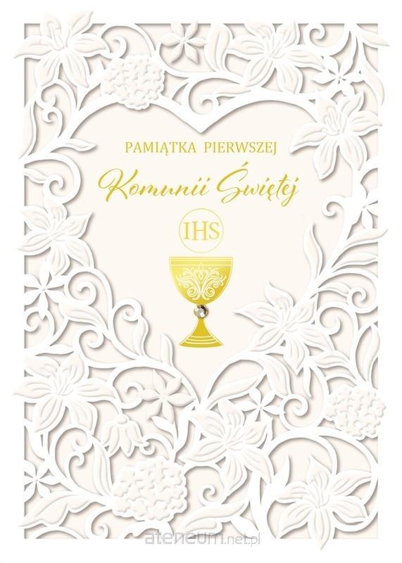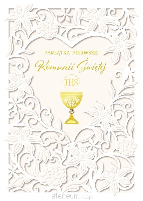 Elegancki karnet na Pierwszą Komunię Świętą w formacie B6 z laserowo wycinanym wzorem. Delikatny, ażurowy motyw z symbolami religijnymi, takimi jak hostia, krzyż czy gołąb. Wewnątrz miejsce na życzenia i dane uroczystości. Idealna pamiątka tego ważnego dnia.