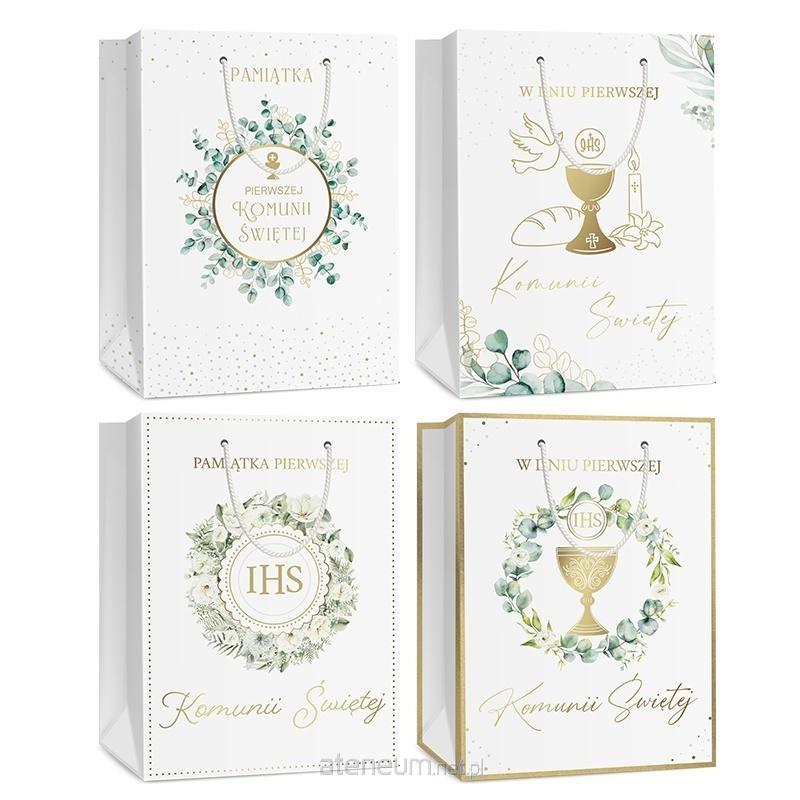 Torba prezentowa w formacie a5, bogato ozdobione srebrną lub złotą folią. Gruby papier o dużej sztywności gramatura 210 g/m torby pakowane po 12 sztuk (4 wzory po 3 sztuki)