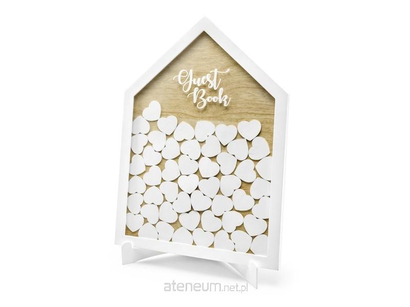 Drewniana księga gości z białym napisem Guest Book, zestaw zawiera księgę w kształcie domu oraz 50 białych serc do wypisania, wymiary ok. 30,5 x 43 cm.