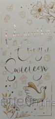 Karnet okolicznościowy z kopertą i życzeniami w środku.