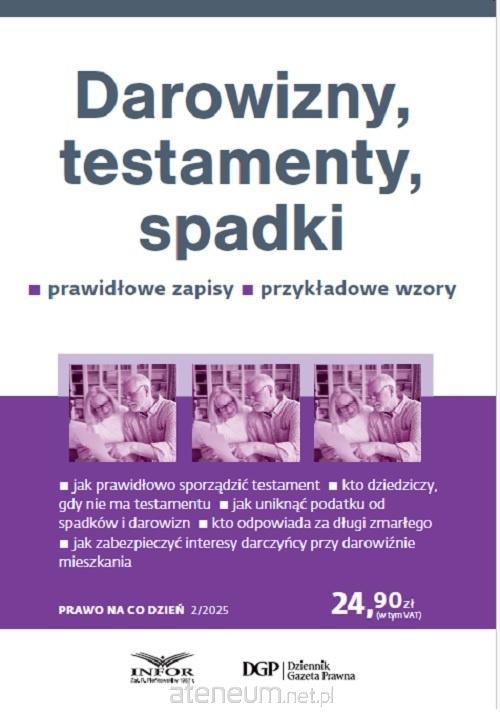 "Darowizny, testamenty, spadki" to praktyczny poradnik, który pomoże zaplanować wszystkie czynności związane z przekazaniem majątku np: na wypadek śmierci. Autorka bardzo przystępnie wyjaśnia, jak prawidłowo i zgodnie z prawem dokonać darowizny, zawrzeć umowę o dożywocie bądź sporządzić testament. Szczegółowo omawia też zasady dziedziczenia ustawowego i testamentowego, skutki darowizny, a także sposób postępowania, by majątek darczyńcy lub spadkodawcy został przekazany zgodnie z obowiązującym prawem. Czytelnik dowie się z książki np: kiedy testament ustny jest ważny, ile czasu ma spadkobierca na odrzucenie spadku, jak sporządzić wniosek o stwierdzenie nabycia spadku do sądu, czym jest zapis testamentowy, kto może żądać zachowku. Ponadto w poradniku "Darowizny, testamenty, spadki" wyjaśniono: jakie są rodzaje testamentów, jak przebiega dział spadku, na jakich zasadach dziedziczą dzieci w rodzinie zastępczej, gdzie znaleźć informacje o rachunkach bankowych zmarłego, jak odrzucić spadek, co dzieje się z małą firmą po śmierci właściciela, kto może dziedziczyć gospodarstwo rolne, czym jest umowa o dożywocie, jak prawidłowo zawrzeć umowę darowizny, czy darowizna zalicza się na poczet zachowku. Poradnik zawiera także wzory umów, testamentów i wniosków w postepowaniu spadkowym. Objaśnia znaczenie najważniejszych postanowień umowy darowizny oraz umowy o dożywocie, które często są stosowane, aby jeszcze za życia przekazać majątek wskazanym osobom. Autorka poświęca także uwagę opodatkowaniu otrzymanych spadków i darowizn. Wskazuje, jak obliczyć należny podatek i jaką deklarację należy przedłożyć do urzędu skarbowego, a w jakich warunkach można uniknąć tego podatku. ATUTY PUBLIKACJI: Prosty język, praktyczne przykłady, wzory umów i wniosków, informacje o wysokości opłat sądowych i notarialnych.
