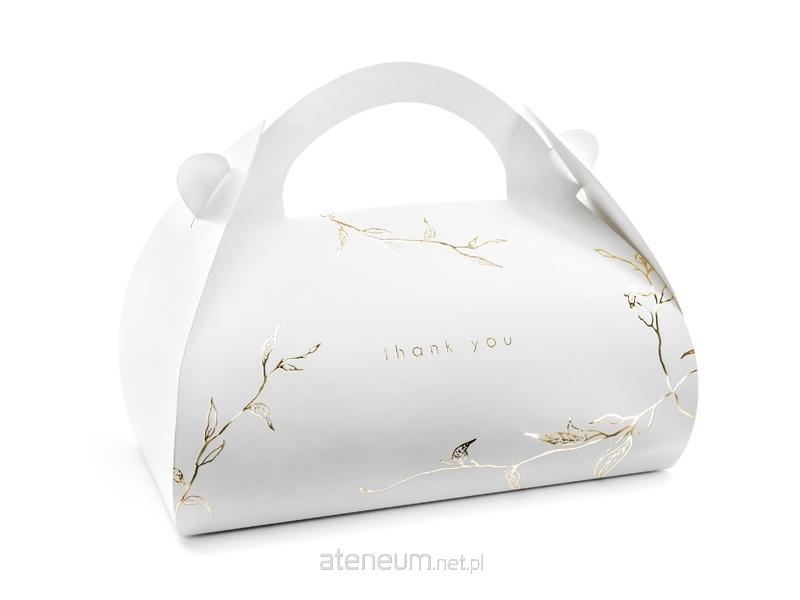 Ozdobne pudełka na ciasto, wykonane z białego papier ze złotym metalizowanym wzorem gałązek. Wymiary po złożeniu ok. 16 x 8,5 x 9,5 cm.(1 op. / 10 szt.)