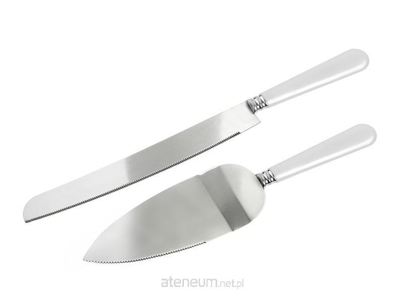 Nóż i łopatka do ciasta, długość całkowita noża 30,5 centymetra, łopatki 24,5 centymetra, długość rączki 9 centymetrów.(1 op. / 2 szt.)