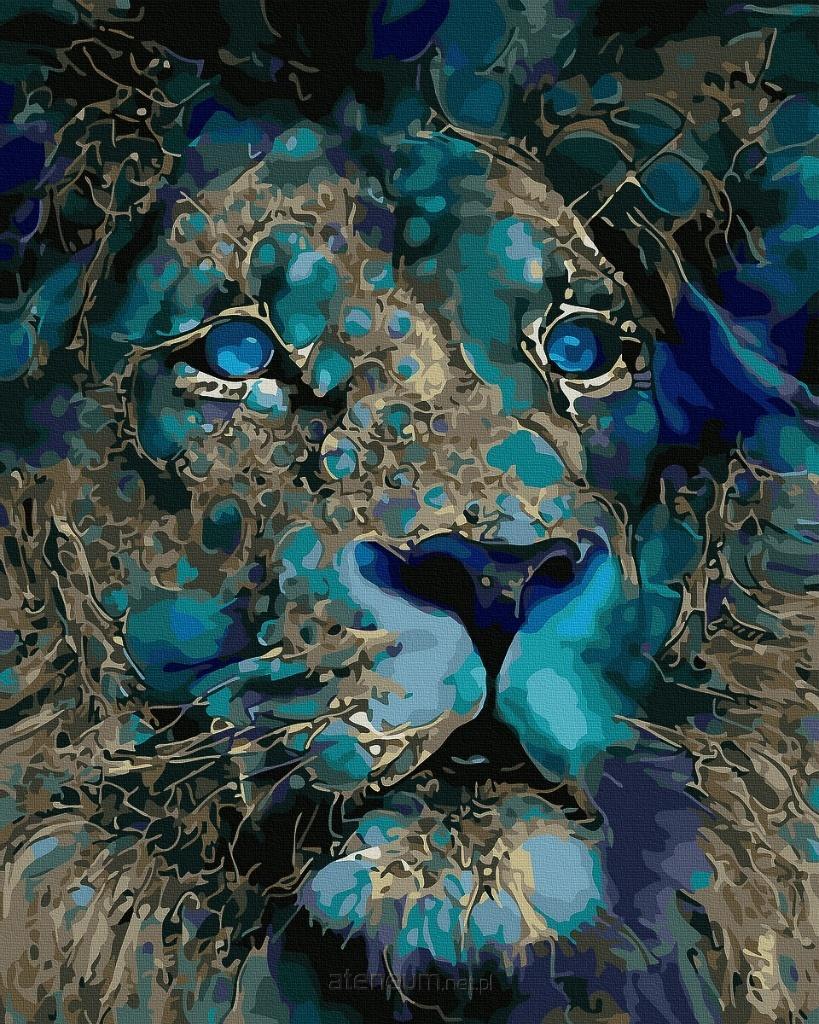 Hipnotyzujące spojrzenie majestatycznego lwa w odcieniach błękitu i turkusu. Obraz emanuje siłą, spokojem i tajemniczością dzikiej natury. Idealny wybór dla miłośników zwierząt i wyjątkowych, artystycznych akcentów we wnętrzu.