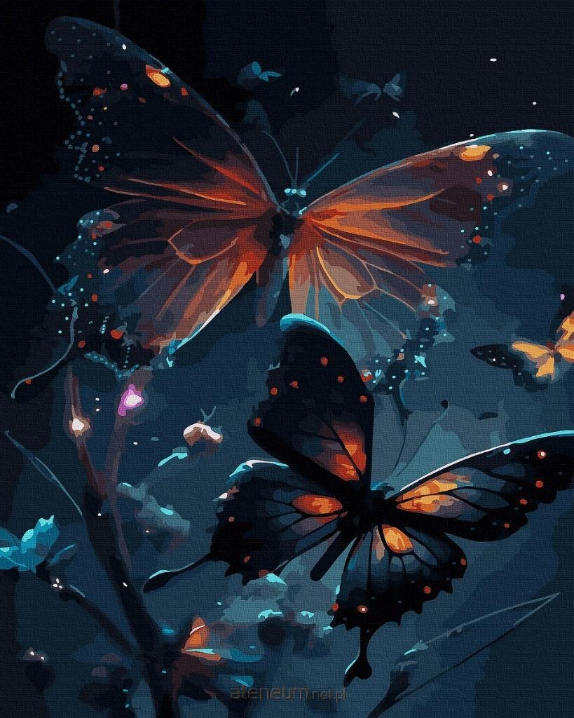 Eteryczne motyle unoszące się w świetle księżyca na tle nocy. Obraz przyciąga wzrok subtelnym kontrastem między błękitem a pomarańczem.