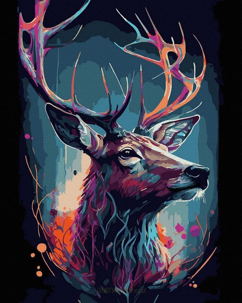Stylizowany jeleń o majestatycznym porożu, pełen jaskrawych kolorów i energii. Świetny wybór dla osób ceniących dziką naturę i nowoczesną estetykę.