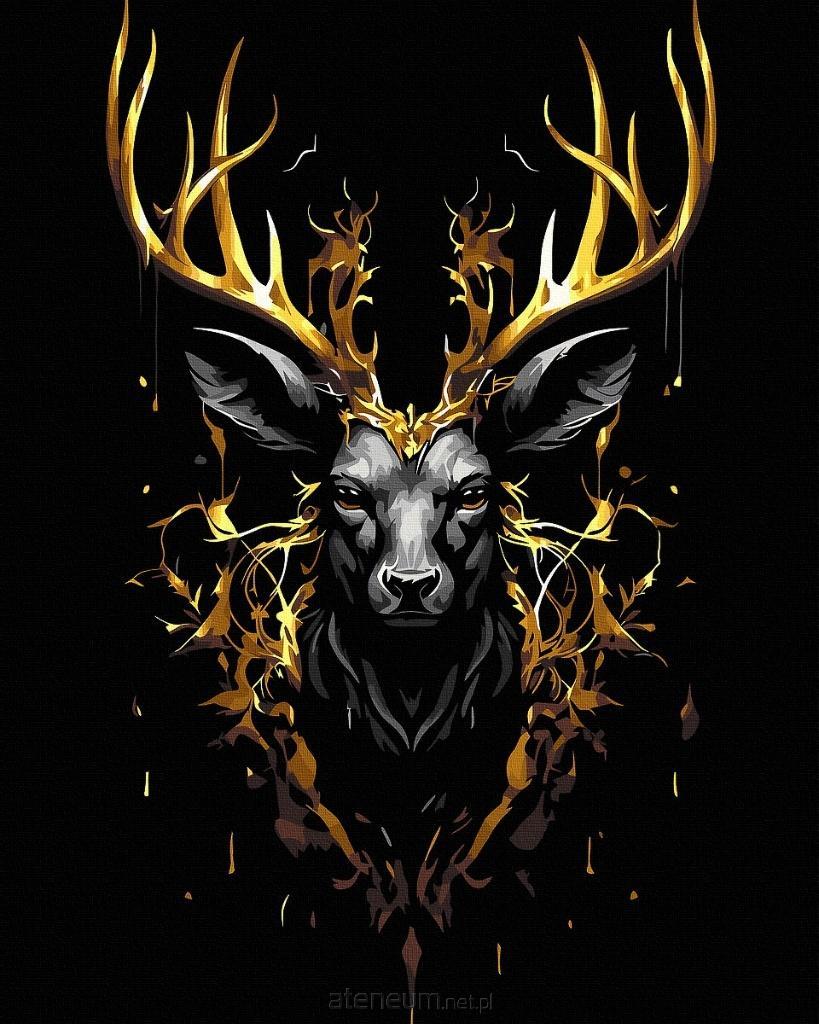 Monumentalny wizerunek jelenia z majestatycznym porożem, oplecionym złotymi, płomienistymi zdobieniami, to propozycja dla miłośników nowoczesnej i pełnej siły sztuki. Czerń tła kontrastuje z intensywnym złotem, co nadaje obrazowi elegancji i wyrazistości.