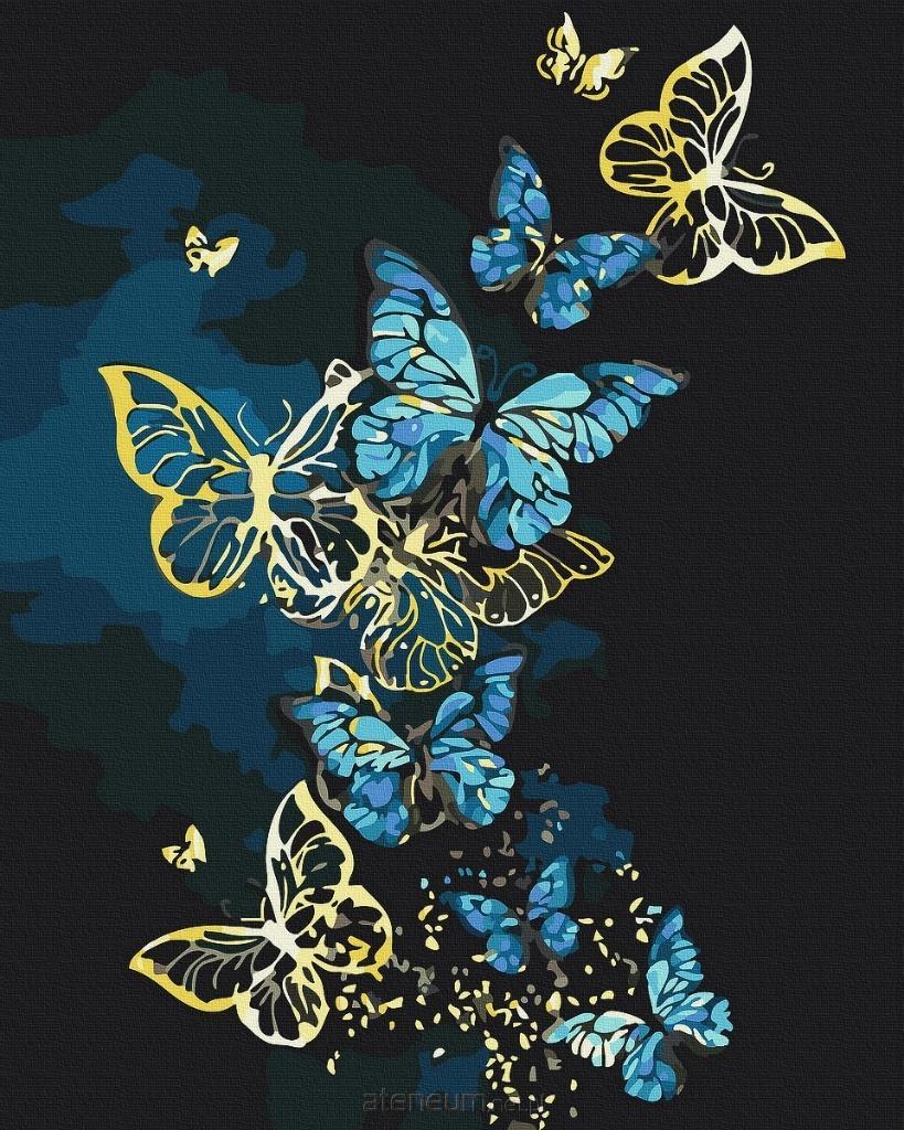 Motyle w odcieniach błękitu i złota unoszące się w ciemności przyciągają uwagę i wprowadzają w bajkowy nastrój.