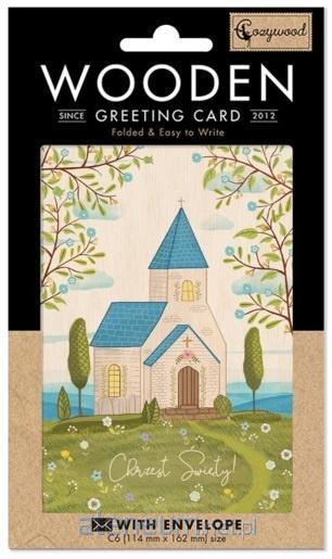 Drewniany karnet w formacie C6 z kopertą. W środku nie zawiera tekstu. Ten karnet jest w 100% biodegradowalny, wykonany przy użyciu minimalnego nakładu energii, gazu i wody. Jego wytworzenie zużywa 5 razy mniej drewna niż wykonanie karnetu papierowego. Wyprodukowany na Litwie.