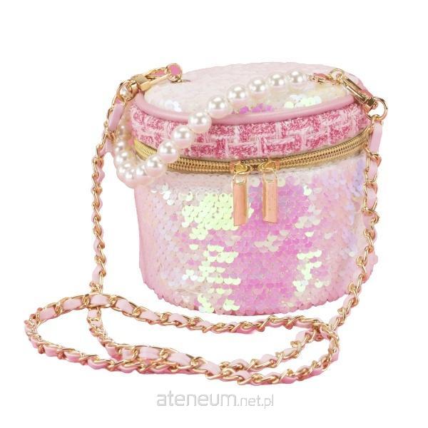 Cekinowa torebeczka połączona delikatnym obszyciem materiałowym, wykończona zdobieniami przy zapięciach, rączka z koralików, długi zdobiony przeplatany łańcuszek na ramię.