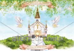Karnet koperta A5 Komunia. Kościółek z dziećmi