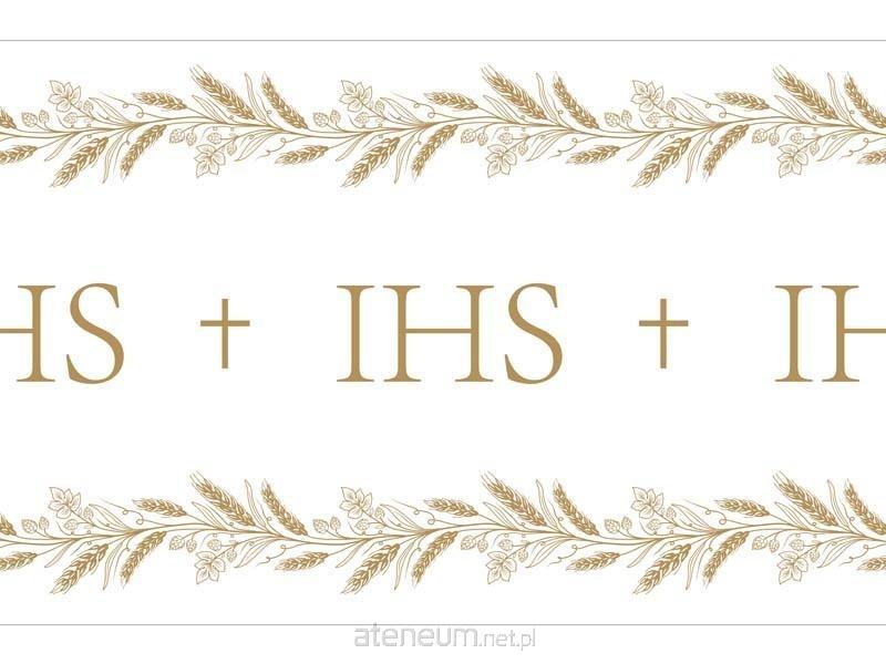 Bieżnik z flizeliny, komunijny w kolorze białym ze złotym nadrukiem. Szerokość ok. 40 cm, długość ok. 5 m