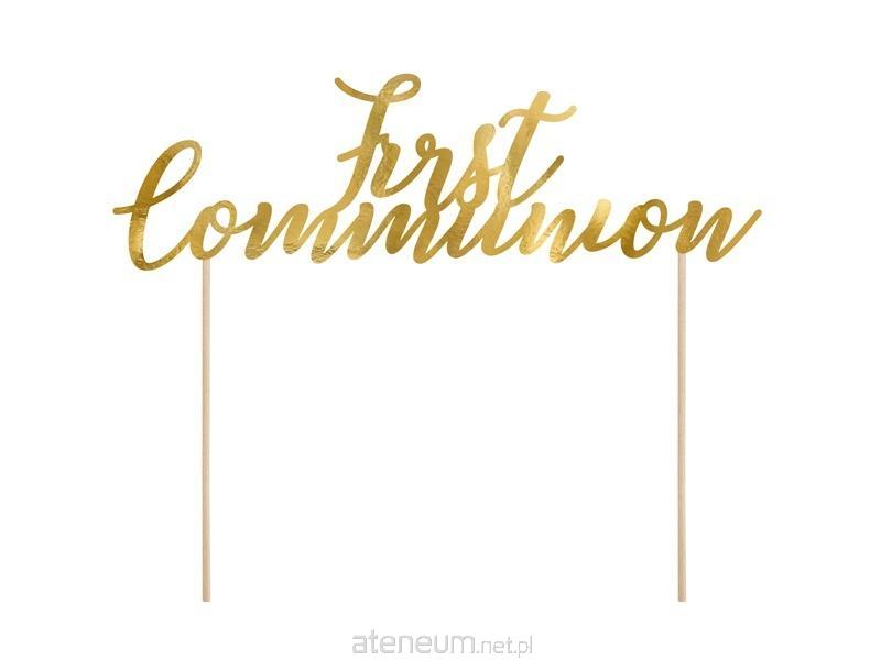 Topper na tort First Communion wykonany z papieru w kolorze złotym lustrzanym, do samodzielnego złożenia, wysokość po złożeniu ok. 21 cm.