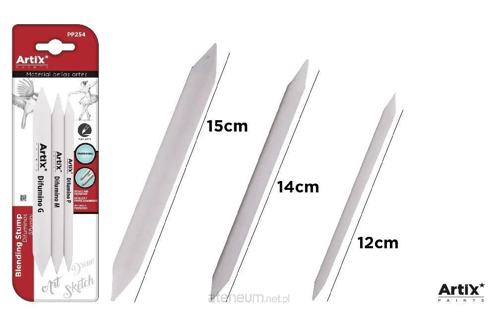 Wykonane z miękkiego papieru celulozowego. Ostre końcówki, takie jak ołówki, które służą do mieszania kolorów, zmiękczają pociągnięcia ołówków grafitowych, pasteli, kolorowych ołówków, węgla lub sangwiników. Idealny do profesjonalnego wykończenia projektów, tworzenia detali lub udoskonalania niektórych wykończeń. Blister po 3 sztukiw trzech różnych grubościach: cienki, średni i gruby.