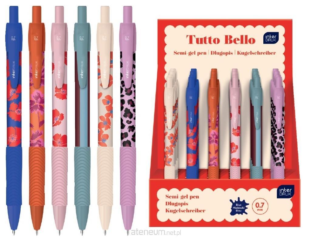 Długopis Tutto Bello to połączenie komfortu i stylowego designu. Niebieski wkład żelowo-olejowy. Wygodny, gumowy uchwyt. Grubość linii pisania: 0.7 mm. Dostępny w 6 stylowych wzorach. 24 szt. w displayu.