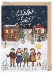 Otwierana kartka, pusta w środku, wykonana na papierze (z certyfikatem EFC) z wyraźnie widoczną fakturą. W zestawie ekologiczna koperta.