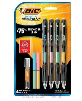 Ten ołówek automatyczny BIC ma wyjątkowo wytrzymały, odporny na złamania grafit 0,7 mm i unikalny mechanizm pochłaniania wstrząsów. Teraz możesz poświęcić się pisaniu, nie tracąc czasu na pstrykanie, aby wysunąć więcej wkładu. To idealne narzędzie do pisania od list zakupów i korespondencji po profesjonalne dokumenty. Opakowanie zawiera 4 ołówki, 6 wkładów grafitowych oraz 4 duże gumki na wymianę. Dostępne są w 4 wesołych kolorach korpusu: zielonym, różowym, żółtym i niebieskim. Koniec z grafitami, które ciągle się łamią! To pomysłowość BIC.