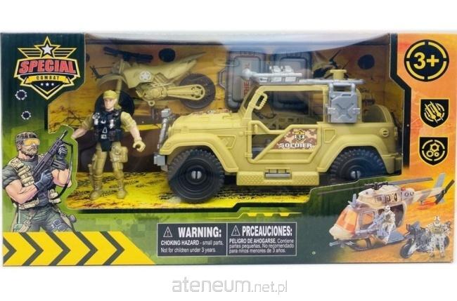 Zestaw zabawek militarnych "Special Combat" to propozycja dla dzieci, które fascynują się militariami i akcją. W opakowaniu znajduje się pojazd terenowy w kolorze piaskowego khaki, przypominający wojskowy jeep. Posiada on detale takie jak koła z bieżnikiem i elementy wyposażenia. W zestawie znajduje się również figurka żołnierza w wojskowym umundurowaniu, gotowego do akcji. Dodatkowo, w górnej części opakowania umieszczony jest motocykl w tym samym kolorze, co urozmaica możliwości zabawy. Zabawka przeznaczona jest dla dzieci powyżej 3 roku życia. Ze względu na małe elementy, zabawka nie jest odpowiednia dla młodszych dzieci. Całość prezentuje się jako kompletny zestaw do zabawy w wojsko, idealny dla dzieci lubiących akcję i odgrywanie ról. Różnorodność pojazdów i figurek pozwala na tworzenie wielu różnych misji i przygód.