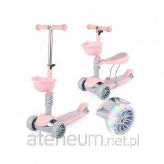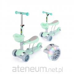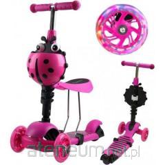 Nasza hulajnoga to produkt o kilku zastosowaniach. Dla najmłodszych, którzy nie posiadają odpowiednich umiejętności do jeżdżenia na hulajnodze w tradycyjny sposób (odpychając się jedną nogą) możemy używać pojazdu w wersji hulajnogi z siodełkiem w formie jeździka. Jest to dobre rozwiązanie dla młodszych dzieci, które zmęczą się tradycyjną jazdą możemy zastosować dołączone siodełko. W tej grupie wiekowej dziecko posiada dodatkowe podparcie pleców w formie miękkiego oparcia. Hulajnoga z pchaczem - dzięki rączce umieszczonej z tyłu jeździka rodzic może cały czas mieć kontrolę nad jazdą dziecka. Takie rozwiązanie może skutecznie zastąpić np. wózek lub rowerek trójkołowy na spacerach z dzieckiem. Dodatkowo pchacz posiada regulację wysokości. Po demontażu oparcia i pchacza urwis może odpychać się od ziemi naprzemiennie nogami i po przez balans ciałem skręcać hulajnogą w prawo lub lewa. Będzie to świetny sposób na wykształcenie u dziecka zmysłu równowagi przydatnego w nauce jazdy np. na rowerze. Taki etap to zamiennik rowerka biegowego.