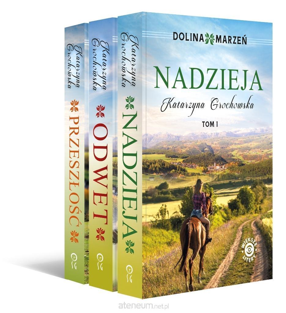 Trylogia Dolina marzeń to historia młodej kobiety, która uczy się dokonywać niezależnych wyborów i brać odpowiedzialność za siebie. Nadia pracuje w renomowanej stadninie niedaleko Warszawy. Konie są jej pasją i pocieszeniem. Tam poznaje Jake'a, który ma swoje tajemnice. Łączy ich miłość do koni. Bohaterowie, zranieni przez los, walczą o swoje szczęście i dążą do pozostawienia za sobą traum z przeszłości. Pakiet Dolina marzeń: Nadzieja, Odwet, Przeszłość. Edycja książki z dużym, wygodnym drukiem do czytania.