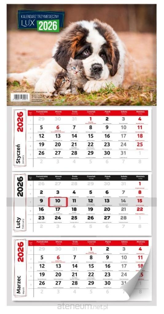 Kalendarz ścienny, trzymiesięczny z okienkiem; 12 kart. 2 wzory główek. Wymiary po rozłożeniu 295x650 mm.
