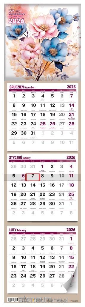 Kalendarz ścienny, trzymiesięczny z okienkiem; 12 kart. Główki wypukłe 2 wzory. Wymiary po rozłożeniu 200x775 mm.