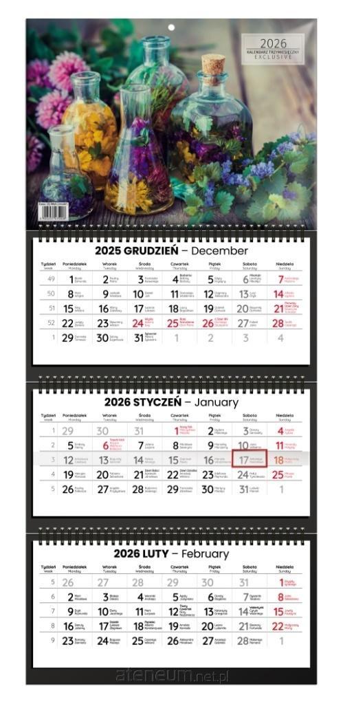 Kalendarz ścienny trzymiesięczny z okienkiem; 12 kart. Główki wypukłe 2 wzory.Łączenie spirala. Wymiary po rozłożeniu 310x710x7 mm.