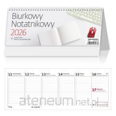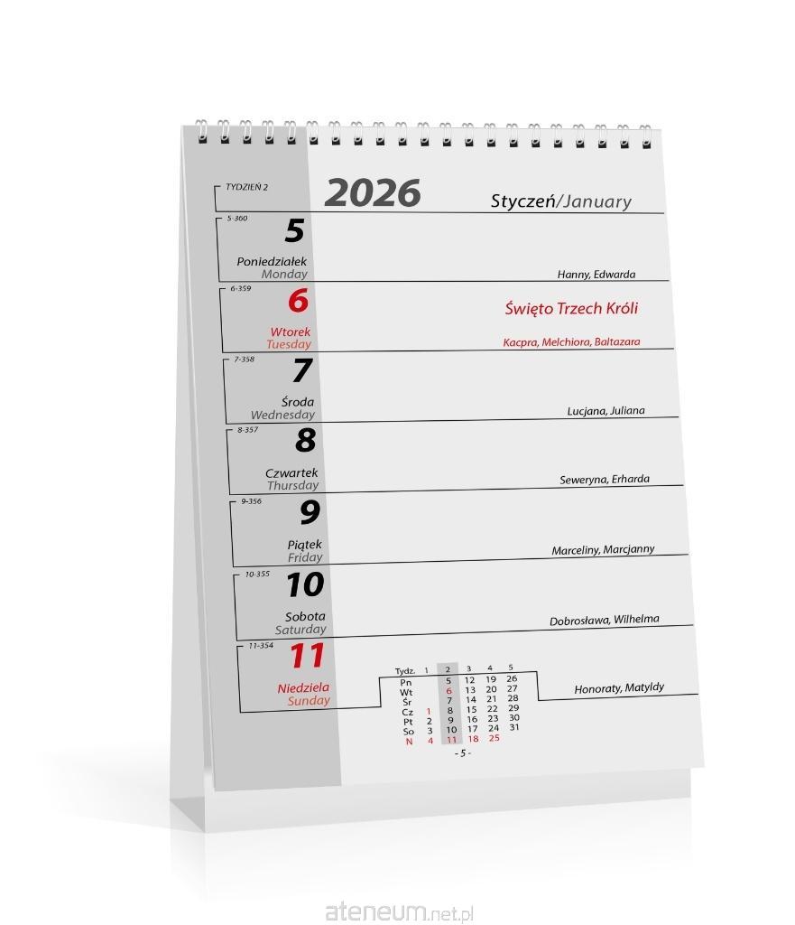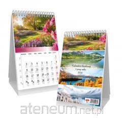 "Kalendarz biurkowy typu namiot, kalendarium w układzie miesięcznym, 54 strony + okładka. Na spirali, papier w środku kreda mat. Wymiary 138x190 mm"