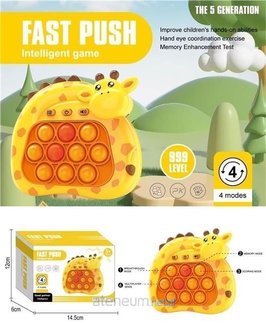 Fast Push - Inteligentna Gra Zręcznościowa z 4 Trybami Zabawy Odkryj "Fast Push" - innowacyjną grę, która łączy w sobie elementy zręcznościowe i logiczne, zapewniając godziny angażującej rozrywki dla graczy w każdym wieku. Ta urocza gra w kształcie żyrafy oferuje aż cztery różnorodne tryby gry, które przetestują Twoją szybkość reakcji, koordynację wzrokowo-ruchową oraz pamięć: Tryb Przełamania (Breakthrough Mode): Pokonuj kolejne poziomy, szybko wciskając podświetlające się bąbelki, zanim znikną! Z każdym poziomem tempo wzrasta, stanowiąc coraz większe wyzwanie. Tryb Pamięci (Memory Mode): Zapamiętaj sekwencję podświetlających się bąbelków i odtwórz ją bezbłędnie. Ten tryb doskonale ćwiczy pamięć krótkotrwałą i koncentrację. Tryb Punktowy (Scoring Mode): W jak najkrótszym czasie wciśnij jak najwięcej podświetlonych bąbelków, aby zdobyć jak najwyższy wynik. Idealny tryb dla miłośników rywalizacji! Tryb Wielu Graczy (Multiplayer Mode): Zmierz się z przyjaciółmi lub rodziną w emocjonującym pojedynku! Reaguj szybciej od przeciwnika i wciśnij podświetlony bąbelek, aby zdobyć punkt. Gra "Fast Push" oferuje aż 999 poziomów trudności, co gwarantuje długotrwałą zabawę i ciągłe wyzwania. Jest to nie tylko świetny sposób na spędzenie wolnego czasu, ale również doskonałe narzędzie do poprawy zdolności manualnych, ćwiczenia koordynacji oko-ręka oraz wzmacniania pamięci. Dzięki swojemu kompaktowemu rozmiarowi (14.5cm x 12cm x 6cm) i lekkiej konstrukcji, gra jest idealna do zabrania w podróż, na wakacje czy do szkoły. Przyjazny design z motywem żyrafy oraz intuicyjna obsługa sprawiają, że "Fast Push" to doskonały prezent dla dzieci powyżej 3 roku życia, a także dla dorosłych, którzy szukają ciekawej i angażującej rozrywki. Zalety gry "Fast Push": 4 ekscytujące tryby gry zapewniają różnorodną zabawę. Aż 999 poziomów trudności dla ciągłych wyzwań. Poprawia refleks, koordynację wzrokowo-ruchową i pamięć. Idealna dla dzieci i dorosłych. Kompaktowy rozmiar - doskonała w podróży. Przyjazny design z motywem żyrafy. Prosta i intuicyjna obsługa. Świetny pomysł na prezent. Spraw sobie lub swoim bliskim "Fast Push" i cieszcie się inteligentną rozrywką na najwyższym poziomie!