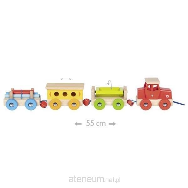 Drewniany skład z lokomotywą i wagonikami do przewozu ładunków. Dziecko może łączyć poszczególne elementy i tworzyć własne trasy, ćwicząc sprawność manualną oraz kreatywne myślenie. Zabawa uczy planowania i rozwija zainteresowanie światem transportu.
