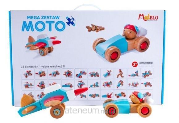 Mega zestaw Moto zawiera 36 drewnianych elementów zapakowanych w karton z bezpiecznym piankowym wypełnieniem. Zestaw zawiera wysokiej jakości, ręcznie wykończone elementy z litego drewna liściastego, a opatentowany system zatrzaskowy click and turn umożliwia łatwe łączenie, rozłączanie i obracanie elementów względem siebie. Zestaw zawiera aż 30 gotowych propozycji pojazdów, samolotów oraz serię 24 unikalnych moto kart w języku angielskim. Z dostępnych w zestawie elementów można stworzyć dużo więcej pojazdów, samolotów, postaci a możliwości te ogranicza jedynie dziecięcą wyobraźnia.