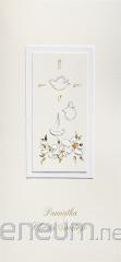 Kartka jest bogato i różnorodnie zdobiona (zależnie od wzoru: metaliczna folia, lakier perłowy, brokat, przyklejone elementy 3D - wypukłe wstawki papierowe, elementy biżuteryjne, tłoczenia).
