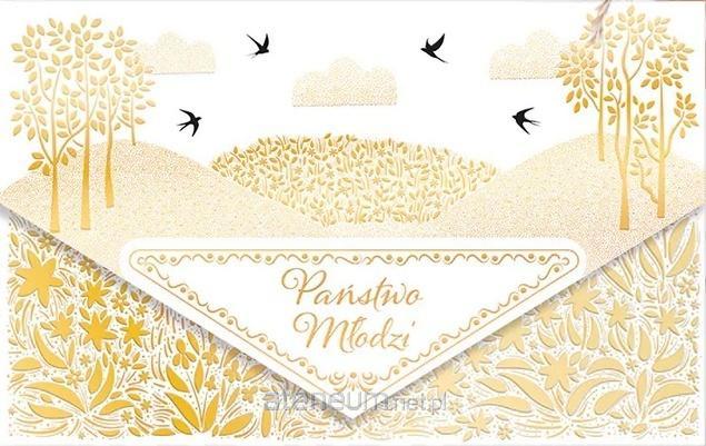 Karnet z kieszonką na pieniądze w formacie A5, składany z trzech. Złocony i tłoczony, teksy życzeń w środku. Wydrukowany na wysokiej jakości papierze. W zestawie koperta.