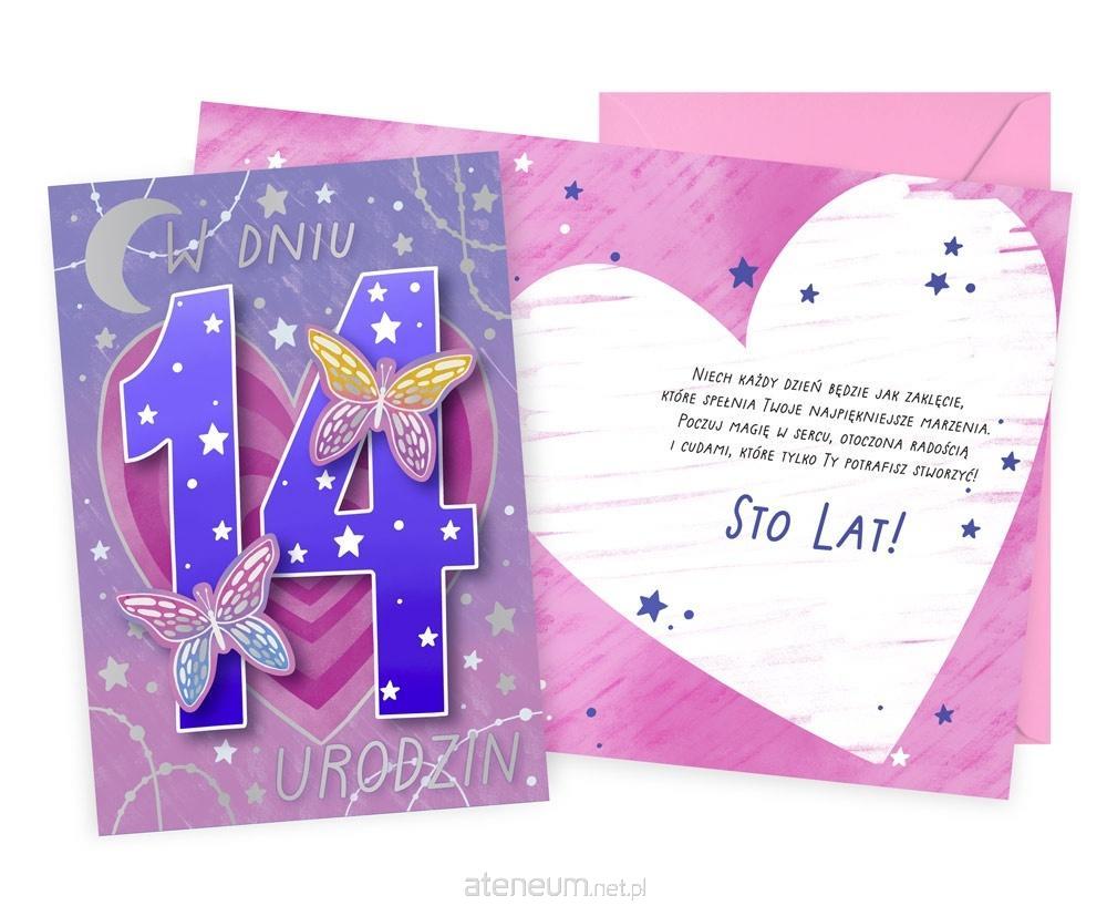 Kartka Dream Cards 'W dniu 14 urodzin" DK-1266 Kartka B6 z ozdobnej serii Dream Cards - nieduża, ale robi wrażenie dzięki atrakcyjnej kolorystyce i ciekawym zdobieniom. To idealny wybór łączący przyjazną cenę z jakością. Cechy szczególne: wielkość: B6, 16.6 x 11.7 cm po złożeniu, koperta: w zestawie, kolorowa, zdobienia: kolorowe, różnorodne, bogate (w zależności od wzoru: przyklejane dekoracje, elementy biżuteryjne, odstawniki, metaliczne folie, tłoczenia itp.), okazja: urodzin