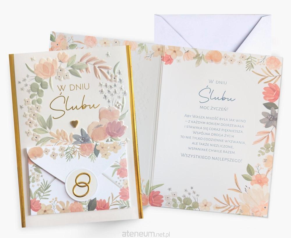 Kartka Dream Cards "W dniu ślubu" DK-1313 Kartka B6 z ozdobnej serii Dream Cards - nieduża, ale robi wrażenie dzięki atrakcyjnej kolorystyce i ciekawym zdobieniom. To idealny wybór łączący przyjazną cenę z jakością. Cechy szczególne: wielkość: B6, 16.6 x 11.7 cm po złożeniu, koperta: w zestawie, kolorowa, zdobienia: kolorowe, różnorodne, bogate (w zależności od wzoru: przyklejane dekoracje, elementy biżuteryjne, odstawniki, metaliczne folie, tłoczenia itp.), okazja: Ślub