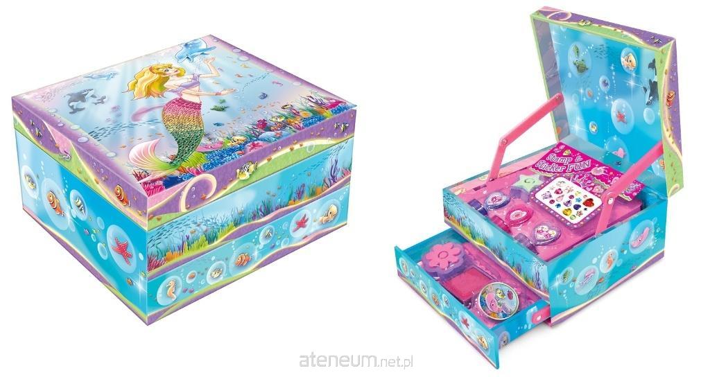 Zestaw zawiera: - 3 pieczątki w różnych kształtach - pojemnik z tuszem - kryształki do wyklejania - naklejki do ozdabiania Zapakowany w ozdobne pudełeczko-szkatułkę z samootwierającą się szufladką. Wystarczy podnieść wieczko, a szufladka sama się wysunie.