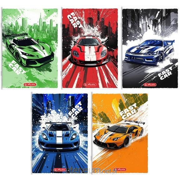 Ilustracje z wyścigowymi samochodami nadają zeszytom dynamicznego charakteru