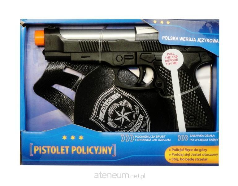 Zabawka z dźwiękami strzelania, przeładowania broni oraz komendami policyjnymi w języku polskim: `Do wszystkich jednostek: Zgłaszam napad, ruszajmy do akcji`, `Policja! Ręce do góry`, `Stój, bo będę strzelał`, `Poddaj się, rzuć broń! Jesteś otoczony`, `Jesteś aresztowany, jedziemy na komendę`. Pistolet w zestawie z imitacją skórzanej kabury. Produkt działa na baterie typu AG10. Baterie znajdują się w zabawce. Zabawka zapakowana w kartonowe opakowanie. Produkt dla dzieci od 3 lat.