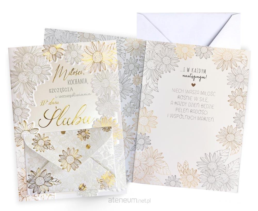 Kartka Dream Cards "Miłości, kochania, szczęścia w dniu ślubu" DK-1315 Kartka B6 z ozdobnej serii Dream Cards - nieduża, ale robi wrażenie dzięki atrakcyjnej kolorystyce i ciekawym zdobieniom. To idealny wybór łączący przyjazną cenę z jakością. Cechy szczególne: wielkość: B6, 16.6 x 11.7 cm po złożeniu, koperta: w zestawie, kolorowa, zdobienia: kolorowe, różnorodne, bogate (w zależności od wzoru: przyklejane dekoracje, elementy biżuteryjne, odstawniki, metaliczne folie, tłoczenia itp.), okazja: Ślub