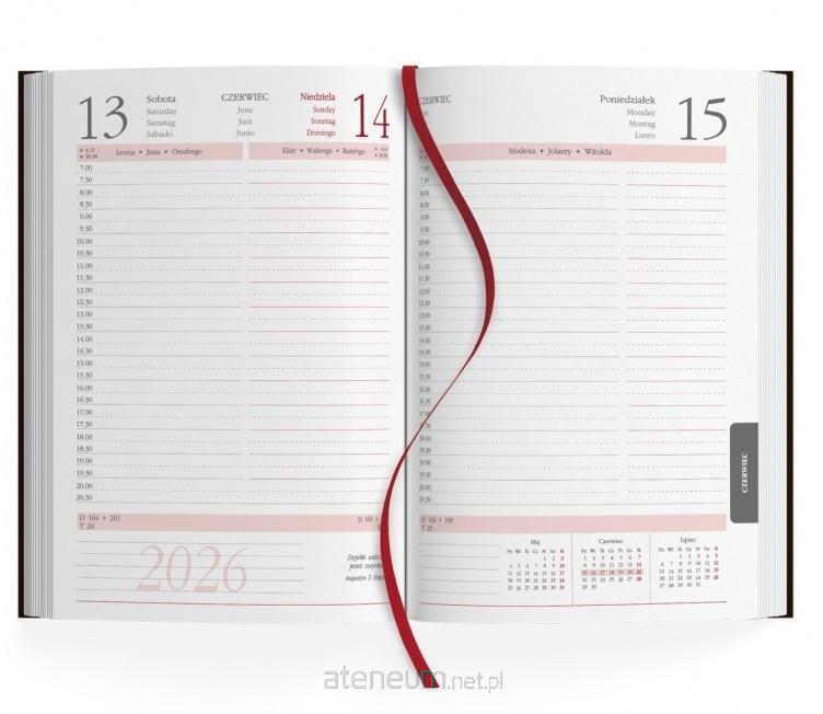w języku polskim, angielskim, niemieckim, hiszpańskim, numeracja dni i tygodni, wschody i zachody słońca, potrójne imieniny