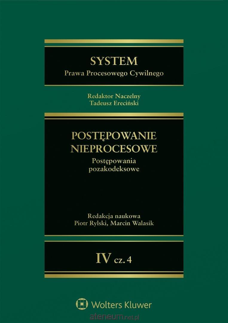 Tom IV Systemu Prawa Procesowego Cywilnego został poświęcony problematyce postępowania nieprocesowego. W 2021 r. ukazała się część 1 tego tomu pod redakcją naukową prof. Tadeusza Erecińskiego oraz prof. Kazimierza Lubińskiego prezentująca zagadnienia ogólne, które odróżniają postępowanie nieprocesowe od procesu. Zagadnienia szczegółowe obejmują postępowania ustanowione dla poszczególnych rodzajów spraw, które są rozpoznawane w trybie nieprocesowym, i są prezentowane w kolejnych częściach tomu IV. Poszczególne postępowania nieprocesowe zostały pogrupowane na podstawie kryterium przedmiotu sprawy. W części 4 podjęto tematykę podstawowych postępowań, które dotyczą spraw skierowanych na drogę postępowania nieprocesowego na mocy ustaw szczególnych. Omówiono postępowania: 1) w sprawach nieletnich, 2) w sprawach wyborczych, 3) w sprawach dotyczących dokumentów, 4) w sprawach z zakresu spółdzielczego prawa mieszkaniowego, 5) w sprawach z zakresu prawa o notariacie, 6) w sprawach z zakresu prawa morskiego 7) o orzeczenie zakazu prowadzenia działalności gospodarczej, 8) w innych sprawach: ze skargi na odmowę przyjęcia zawiadomienia o utworzeniu komitetu inicjatywy ustawodawczej, dotyczące wyborów do rady powiatowej izby rolniczej, postępowania z ustawy o własności lokali, o rozstrzygnięcie w ramach zarządu nieruchomością wspólną w razie braku zgody większości właścicieli lokali, o przyznanie państwowej kompensaty przysługującej ofiarom niektórych czynów zabronionych, wobec osób z zaburzeniami psychicznymi stwarzających zagrożenie życia, zdrowia lub wolności seksualnej innych osób. Tom IV część 4 Systemu Prawa Procesowego Cywilnego pod tytułem "Postępowanie nieprocesowe. Postępowania pozakodeksowe" pod redakcją naukową Piotra Rylskiego i Marcina Walasika jest opracowaniem zbiorowym przygotowanym przez autorów reprezentujących różne ośrodki naukowe i instytucje w Polsce. Przejrzysty układ, najwyższy poziom merytoryczny i edytorski dzieła z pewnością sprawią, że publikacja będzie stanowić nieocenioną pomoc przede wszystkim dla prawników praktyków: sędziów, referendarzy sądowych, adwokatów, radców prawnych, notariuszy, komorników sądowych.