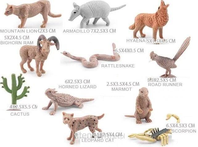 Odkryj świat pustyni z zestawem realistycznych figurek zwierząt - Idealne do zabawy edukacyjnej i kolekcjonowania! Przenieś się w fascynujący świat pustyni z naszym kompleksowym zestawem 11 realistycznych figurek zwierząt i roślin pustynnych! Ten wyjątkowy zestaw został zaprojektowany z myślą o małych odkrywcach, ale sprawdzi się również jako element kolekcji dla starszych pasjonatów przyrody. W skład zestawu wchodzą: Lew górski (Mountain Lion): Majestatyczny drapieżnik pustyni. Pancernik (Armadillo): Unikalny ssak z charakterystycznym pancerzem. Hiena (Hyaena): Sprytny padlinożerca. Grzechotnik (Rattlesnake): Groźny gad z grzechotką. Kaktus (Cactus): Ikoniczna roślina pustynna. Owca górska (Bighorn Ram): Imponujący roślinożerca. Jaszczurka rogata (Horned Lizard): Fascynujący gad pustynny. Marmot (Marmot): Uroczy gryzoń. Biegacz naziemny (Road Runner): Szybki ptak pustynny. Lampart (Leopard Cat): Elegancki drapieżnik. Skorpion (Scorpion): Niebezpieczny stawonóg. Każda figurka została wykonana z wysokiej jakości, trwałego materiału, z niezwykłą dbałością o detale, co sprawia, że modele są wiernym odwzorowaniem swoich odpowiedników w naturze. Realistyczne kolory i faktury zachęcają do kreatywnej zabawy i nauki o różnorodności ekosystemów pustynnych. Dlaczego warto wybrać nasz zestaw? Edukacja przez zabawę: Dzieci mogą poznawać nazwy zwierząt, ich wygląd i cechy, rozwijając jednocześnie wyobraźnię i umiejętności narracyjne. Wysoka jakość wykonania: Trwałe figurki, które posłużą przez długi czas. Idealny prezent: Doskonały upominek dla małych miłośników zwierząt, na urodziny, święta czy inne okazje. Kompaktowe rozmiary: Łatwe do przechowywania i zabierania w podróż. Rozbudź ciekawość świata w swoim dziecku i podaruj mu ten fascynujący zestaw figurek zwierząt pustyni!