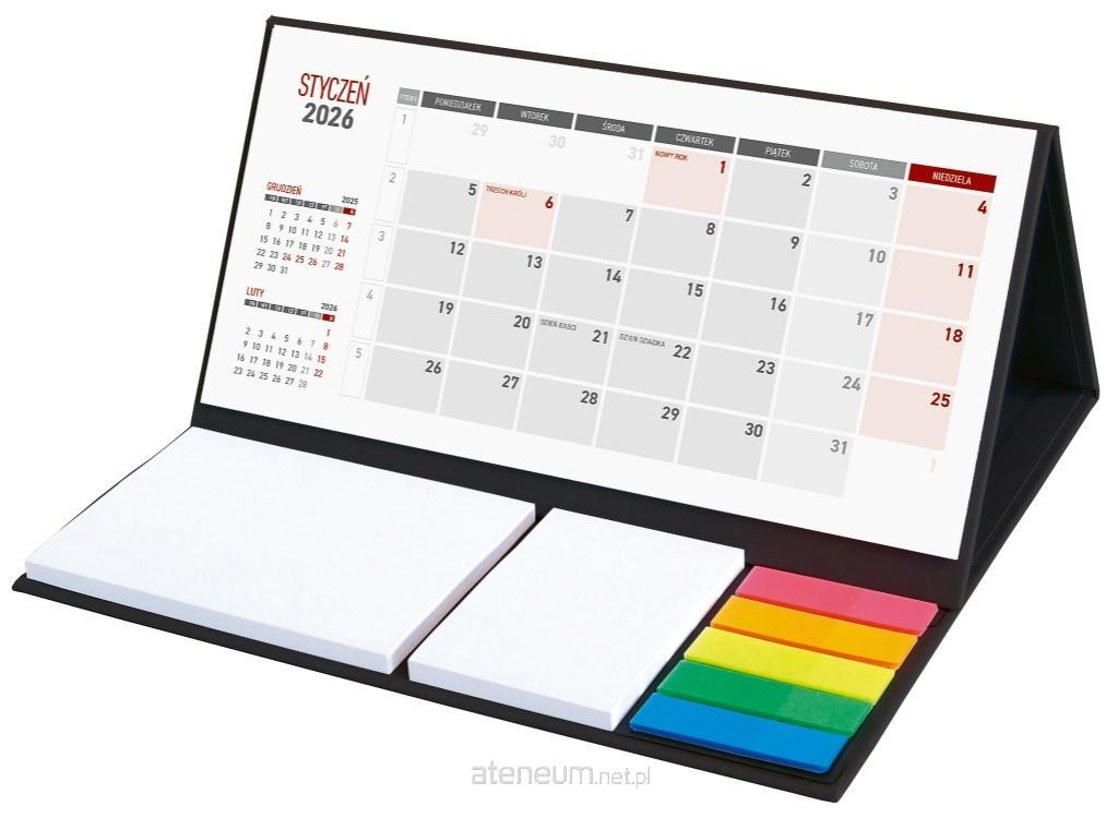 Wygodny kalendarz stojący na biurko z przejrzystym kalendarium w układzie miesięcznym z poręcznymi karteczkami samoprzylepnymi do notowania. Przydatny zwłaszcza w biurze. W kalendarzu zaznaczono święta.