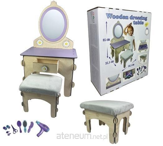 DUŻY, drewniany kolorowy zestaw toaletka z taboretem! Zestaw zawiera: toaletkę z lustrem, taboret w kolorze szarym, zestaw kosmetyczny zawiera: suszarkę do włosów, szczotkę do włosów, grzebień do włosów, małe lusterko, nożyczki, wałki do włosów, spinki do włosów. Całość znajduje się w kolorowym opakowaniu.
