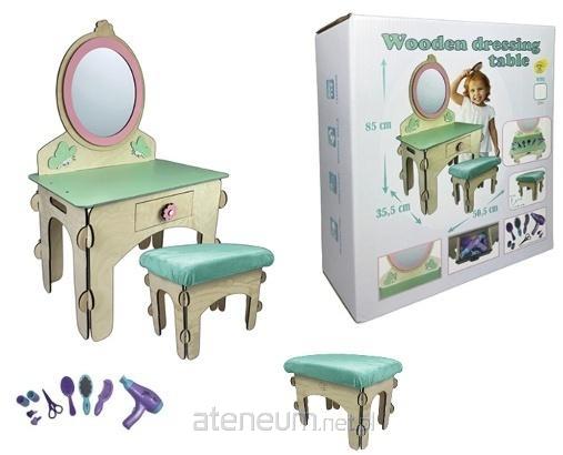 DUŻY, drewniany kolorowy zestaw toaletka z taboretem! Zestaw zawiera: toaletkę z lustrem, taboret w kolorze szarym, zestaw kosmetyczny zawiera: suszarkę do włosów, szczotkę do włosów, grzebień do włosów, małe lusterko, nożyczki, wałki do włosów, spinki do włosów. Całość znajduje się w kolorowym opakowaniu.